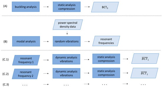The scheme of the procedure for calculating the decrease in the load-bearing capacity of the packaging due to random vertical transport loading Steps from (A–C.3).
