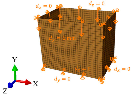 In the study, the static analysis of the box compression, as shown in Figure 3A, replicated the laboratory test conditions, which was similar to [3,16,17]. In the finite element method (FEM) analysis, only the load-bearing walls of the packaging were modeled (Figure 4). The bottom and top flaps were taken into account by applying appropriate boundary conditions. The out-of-plane displacements on the bottom and top edges of the sidewalls were blocked. The box compression test was simulated by applying a vertical displacement to the top edges of the box. The other details on the finite element mesh and constitutive modeling will be described at the end of this section.