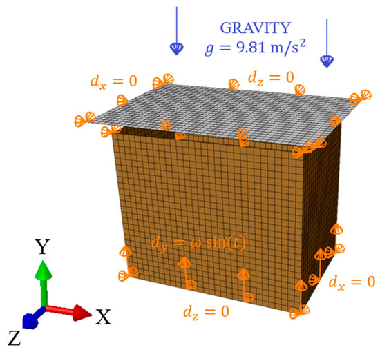 Compared to the static model, a rigid plate was added to the dynamic explicit analysis to simulate the 8 kg load used in a real vertical random vibration test, as shown in Figure 3(steps C.1–C.3). The dynamic analysis consisted of two computational steps. In the first step, the model was loaded with gravity (), which caused the plate to fall onto the packaging. The packaging “held” the rigid plate by applying contact between these two modeled objects. As in the case of the static analysis, the out-of-plane displacements at the bottom and top edges of the packaging were blocked. The in-plane displacement of the plate was also blocked, as shown in Figure 5. In the second step, the bottom of the box vibrated in the time domain with a sinusoidal amplitude of 1 mm and a frequency obtained from the modal analysis.