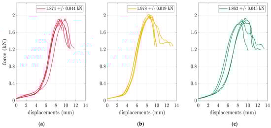 The compressive strength curves of the boxes due to transport loading after each impact are summarized in Figure 10. The characters of the curves compared for increasing the number of impacts were different, and they did not scale linearly. Additionally, there were no similarities between the boxes, as shown in the comparison between Figure 10a,c. Both presented strength curves after the first, second and fourth impacts. It can be observed that for the yellow and green curves, the changes in the shape were completely different.