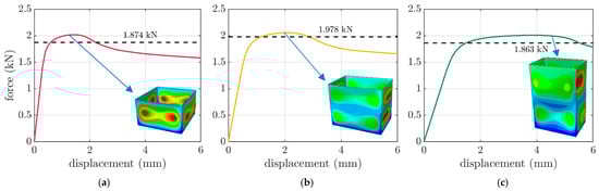 Box compression test results for the FEFCO F201 boxes from the numerical analyses: (a) mm, (b) mm and (c) mm.