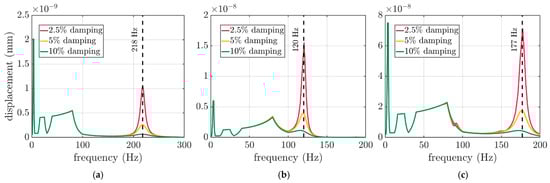 In the random response analyses, three levels of damping were considered, i.e., , and The computational outcome due to the modal analysis is demonstrated in Figure 8. The change in the damping factor determines the activity of a particular frequency, which is identified as the resonant frequency, . Therefore, for each case of the boxes, three curves are presented in each subplot in Figure 8. The values of 218 Hz, 120 Hz and 177 Hz were identified as the resonant frequencies for the mm, mm and mm boxes, respectively, as shown by the dashed vertical lines.