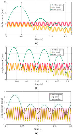 One of the most interesting results was presented in Figure 9, which demonstrated the interactions between the reflecting rigid plate and the induced vibrations in the packaging. As shown in Figure 9a, the lowest box interaction was presented, i.e., the mm case. In this case, the rigid plate was initially raised relatively high at about mm. The first (s) and subsequent impacts (s and s) significantly deformed the packaging since the top point of the plot (yellow curve) successively decreased its level after each bounce, which was similar to the successive positions of the rigid plate (green curve).