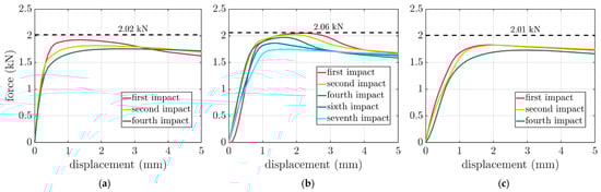 The results of the FEM computations after a different number of impacts for the boxes considered in the paper are presented in Figure 10 for the mm, mm and mm boxes. In each subplot, the dashed curve demonstrates the compression strength level from the stress-free FEM static analysis, while the colors represent the selected force–displacement curves after a particular number of impacts.