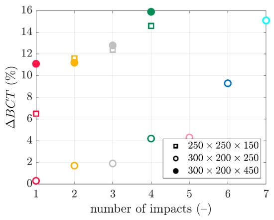 The synthetic data from Figure 10 are shown in Figure 11, in which the trends in the compressive strength decrease due to transport loading can be observed for a different number of impacts. Figure 11 demonstrates that the medium height packaging, the mm box, was the most resistant to the BCT reduction due to the transport load. That is, the s were the lowest for these cases (empty circles). From the first to the fifth impact, the did not exceed . Only after the sixth and seventh impacts did the s equal nearly and , respectively. Moreover, the lowest packaging, the mm box, demonstrated a relationship close to the linear decrease in the BCT with an increasing number of impacts. Here, the values ranged from approx. to for the first to fourth impacts (empty squares). Moreover, for the highest packaging, i.e., the mm box, the obtained values were similar to those for the lowest packaging, although this packaging showed the highest values. For example, for the first impact obtained a value of 11% (filled circles).
