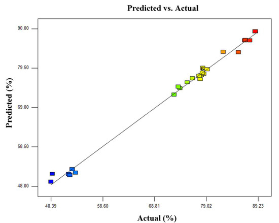 Figure 2 displays the linear correlation between the predicted and experimental values of the Zn effective extraction rate. It can be concluded from Figure 2 that the experimental values were highly consistent with the predicted values. The experimental values were uniformly scattered on both sides of the predicted values, demonstrating that the quadratic model was suitable to describe the correlation of experimental factors and the Zn effective extraction rate. In other words, the proposed model accurately reflected correlations between different parameters.
