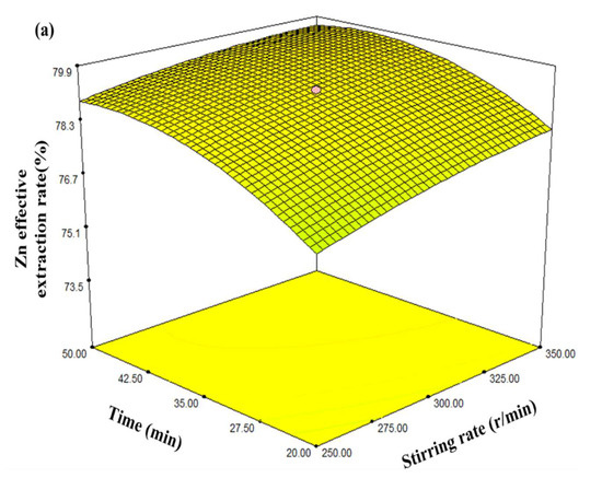 During response surface optimisation, the model accuracy was verified before data analysis. The accuracy of the proposed model was investigated using Design Expert (STAT-EASE, Stat Ease Inc., Minneapolis, MN, USA). The Zn effective extraction rate (Y, %) was the dependent variable, and the stirring speed (X1, r/min), leaching time (X2, min), total ammonia concentration (X3, mol/L), and liquid/solid ratio (X4, mL/g) were selected as the variables.