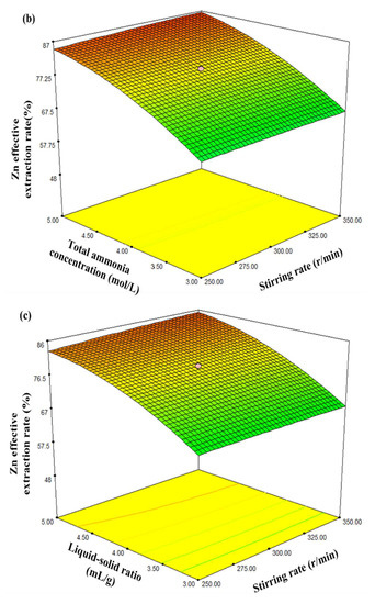 Based on the above regression analysis and variance analysis, the effects of different factors on the Zn effective extraction rate were investigated, by establishing 3D response surfaces of the regression model based on statistical calculations of the regression coefficients. Based on the optimised model, the response surfaces of the influences of stirring speed, leaching time, total ammonia concentration, and liquid/solid ratio, as well interactions between these factors on the Zn effective extraction rate, were obtained, and the results are plotted in Figure 4.