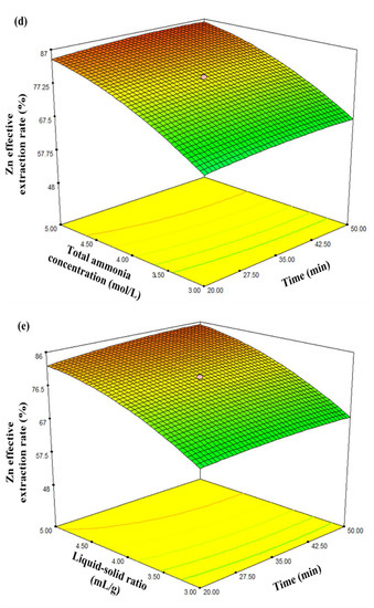 As illustrated in Figure 4a–c, leaching time, total ammonia concentration, and liquid/solid ratio presented greater effects on the Zn effective extraction rate than stirring speed. It can be observed in Figure 4d,e that the influences of total ammonia concentration and liquid/solid ratio showed greater effects than leaching time. Moreover, it is depicted in Figure 4f that the interactions between the total ammonia concentration and liquid/solid ratio exerted the most significant effects on the Zn effective extraction rate, and this conclusion is consistent with the above variance analysis. Furthermore, as shown in Figure 4f, simultaneously increasing total ammonia concentration and liquid/solid ratio can significantly improve the Zn effective extraction rate, before reaching a plateau value. The influences of total ammonia concentration and liquid/solid ratio are different, wherein increasing the total ammonia concentration increases the concentration of coordination agents, while the increase in L/S ratio can enhance the rapid dissolution of zinc oxide, and the solubility of [Zn(NH3)]2+ and (RCOO)2Zn in solution can be increased accordingly, further promoting the dissolution of zinc in MSD samples. As a result, the ion diffusion resistance decreases, and the leaching behaviour of Zn ion is strengthened, further enhancing the Zn effective extraction rate. However, once the values of the total ammonia concentration and liquid/solid ratio exceeded critical levels, the further increase in the two factors values had negligible effects on the Zn effective extraction rate. Since the materials in the container remain constant, the interfacial areas of Zn-containing minerals and NH3-CH3COONH4-H2O leaching agents are constant. Therefore, under the conditions of the sufficiently large quantity of the leaching agent and maintaining the effective mass transfer and maximal reactions between Zn-containing minerals, the Zn effective extraction rate can be maximised by leaching from the MSD sample using NH3-CH3COONH4-H2O leaching agent.