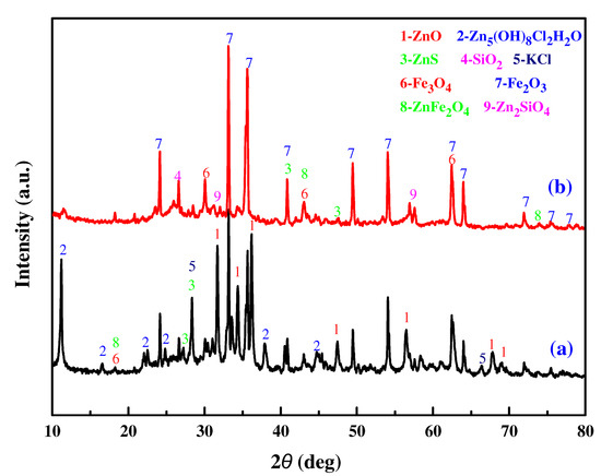 To determine the metal ions and impurities existing in the MSD sample and the leaching residues, the MSD samples and the leaching residues were characterized by a rotating target multi-functional X-ray diffractometer (TTRA III, Rigaku, Japan). The operation power of the X-ray generator was 18 kW, CuKα irradiation (λ = 1.54056 Å) was applied, and the voltage and the current were 40 kV and 200 mA, respectively. Under filtering using a graphite monochromator with a high reflection efficiency, scanning was conducted with a scanning rate of 4°/min from 10°–90°. The XRD pattern of the MSD sample is illustrated in Figure 5a. The XRD pattern revealed that Zn presented as ZnO, Zn5(OH)8Cl2·H2O, ZnS, ZnFe2O4, and Zn2SiO4, while Fe mainly presented as Fe3O4 and Fe2O3. The diversity of the zinc phase and the presence of iron suggest that the process of extracting zinc from the MSD sample is very difficult. Figure 5b shows an XRD comparison of leaching residues under optimized conditions. As shown in Figure 5, the diffraction peaks of ZnO and Zn5(OH)8Cl2H2O disappear, and the main residual zinc phases in the leaching slag are zinc ferrite (ZnFe2O4), zinc silicate (ZnSiO4), and zinc sulfide (ZnS).