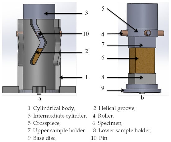 The aluminum foams’ deformation mode and yield behavior were studied using a combined compression-reverse torsion load. These experiments were conducted by employing the S-profiled ACTP rig, as shown in Figure 1 and Figure 3. The fundamental role of this rig is to provide the possibility to test material and structure by compression-torsion, such as crushing of metal foams, as already demonstrated in [28,29,30,31,32]. The goal of this rig is to transform the external unidirectional load into multidirectional load components [28,29,30,31]. The new rig used in this study generates a reverse compression-torsion loading configuration. The S-profiled rig can be described by the concurrent combination of axial compression and torsion. This S-profiled rig (Figure 1) consists essentially of a hollow tempered steel cylindrical body (1), in which four parallel S-shaped helicoid machined grooves (2) were machined and characterized by an inclination angle controlling the rate of change of the torsional component during compression. The effect of this parameter on the behavior of the specimen was studied using three different interchangeable cylindrical bodies of 45°, 53°, and 60°, respectively. The helicoid grooves receive a crosspiece (5) having four pivots (10) equipped with rollers made from bronze (4) guiding it in its movement of descent by instilling a rotational movement. This mechanism allowed the transformation of an initial uniaxial external load into a biaxial combined compression-torsion one. The bronze rollers have a role in minimizing the friction between the grooves (2) and the crosspiece (5). The deformed foam has a square prism form (6). On the bottom part of the sample holders, threaded holes were provided to fasten the bottom sample holder (8) to the base (9) and to fix the top sample holder (7) with the top guide (3).