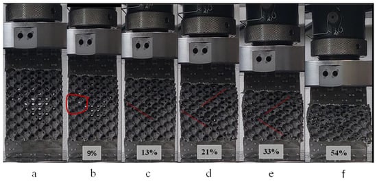 Figure 7 shows two typical examples of the evolution of plastic flow for the two classical and alternating biaxial configurations Bi-53° and S-Bi-53°. The red ellipses show the difference in plastic collapse band between the samples deformed using the classical ACTP rig (Figure 7a) and the new ACTP-S rig (Figure 7b). Indeed, observation reveals a more regular and pronounced deformation band with higher densification of the foam for the Bi-53° case. As for its counterpart S-Bi-53°, the localized deformation is less regular with the persistence of pores barely solicited. Nevertheless, the mechanism of rupture is more important here, in other words, it is predominantly compared to the classic case.