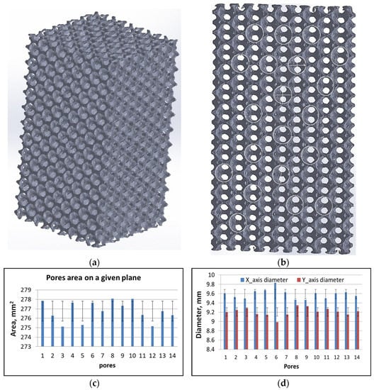Figure 5a,b shows the X-ray tomography of the undeformed sample as received. It was observed that the pores are equal in size and uniformly distributed. The distributions of the struts, the pores, and other features have been achieved through X-ray tomography which provides the reliability of the manufacturing techniques. The areas, major and minor diameters of the pores along specific planes were calculated using ImageJ 1.8.0, software (Figure 5c,d). The area standard deviation of 1.0 and diameter standard deviation of 0.1 along the x-axis and 0.0 along the y-axis were obtained. Such values elucidate that the pores have an almost similar diameter on the given plane.