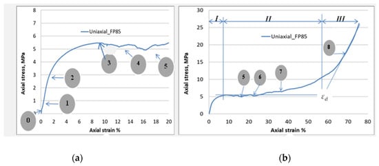Figure 6. Engineering stress–strain curve under uniaxial compression loading. (a) initial region of the stress–strain curve up to strain = 20%, and (b) stress–strain curve up to fracture.