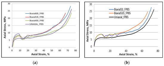 Figure 8. Plots showing the stress evolution versus strain for FP-85 and the impact of loading conditions on their behavior: (a) for S-profile, and (b) S-Bi-53° and Bi-53° behaviors for comparison.
