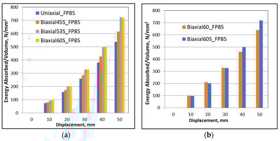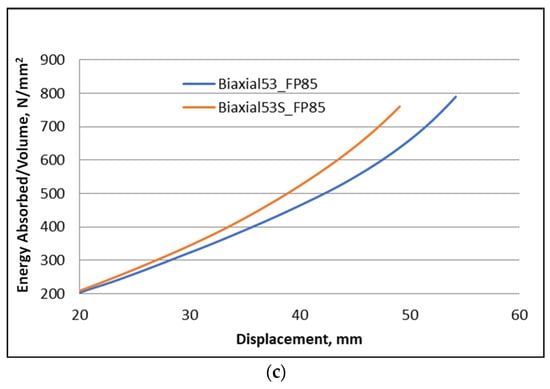 Several displacement stages were selected presenting the evolution of the energy dissipated during the crushing process for a given load and also comparing the effect of all the biaxial loading conditions and their impact on the capacity of the foam to dissipate energy (Figure 10a). A comparison was performed targeting the effect of biaxial loading conditions and their impact on the foam’s ability to dissipate energy (Figure 10a). As expected, this capacity increases with increasing loading complexity.