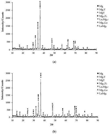 Figure 9a), XRD peaks of the Mg-4.71 Y-3.98 La alloy terminated with Y
