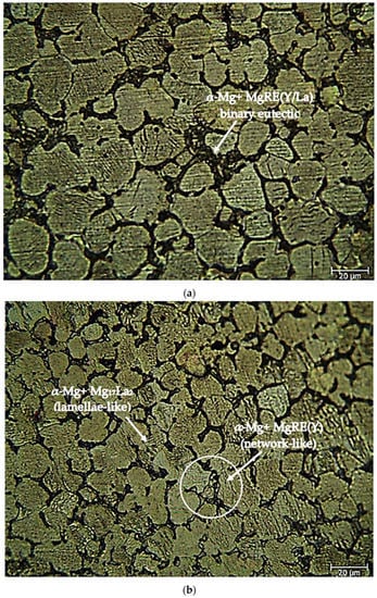 Figure 12) corroded after homogenization, it can be seen that the Mg-4.71 Y-3.98 La alloy has intensely indented structures, and the Mg-3.21Y-3.15 La alloy has small pits between the porous structures. The Mg-3.21Y-3.15 La and Mg-4.71 Y-3.98 La alloys have formations similar to the SEM micrographs (