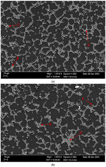 Table 5 shows the EDS findings of the second phases with distinct morphologies labelled (A-D) in