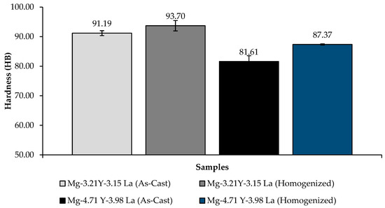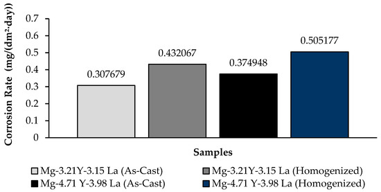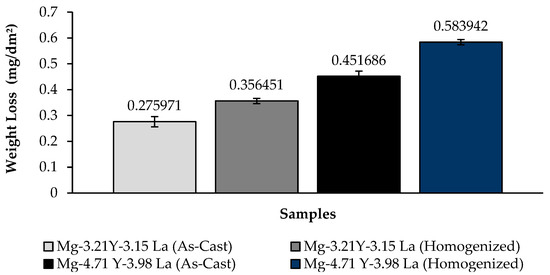 2. The highest weight loss was observed in the homogenized Mg-4.71 Y-3.98 La alloy with a value of 0.583942