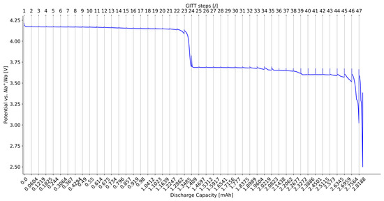 The experiments were carried out with a BioLogic (Claix, France) electrochemical workstation while keeping the electrode in climate chamber conditions at 25 °C. The evolution of the electrode potential with respect to both discharge capacity and GITT steps is illustrated in Figure 1. The total discharge capacity of the GITT characterization is equal to 2.81 mAh.