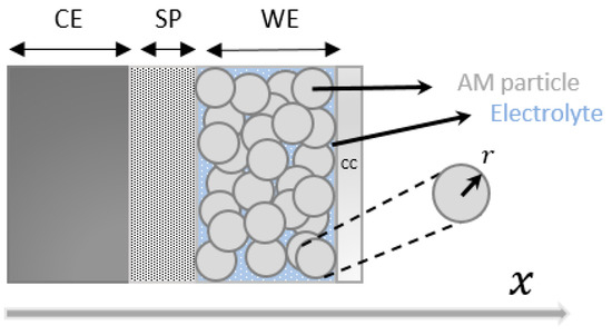 The schematic of the half-coin cell considered for P2D modeling is illustrated in Figure 2. The working electrode (WE) refers to NVPF, the counter electrode (CE) refers to sodium metal, and SP and CC refer to the separator and aluminum current collector, respectively. Two dimensions in space are considered: the macroscopic x direction across the half-cell, and the microscopic radial direction across the electrode particles. The NVPF electrode is considered porous, associated with two solid and electrolyte phases. The solid phase is assumed to be made of uniformly distributed spherical particles of the same size. Hence, calculation of the effective conductivity and diffusivity parameters via Bruggerman’s correlation is allowed. Further, it is considered that no volume change occurs in the active material particles of the NVPF electrode during the insertion mechanism of Na+, and the voltage drop across the aluminum current collector is negligible. The temperature of the half-cell is considered to remain constant during the discharge or sodiation of the NVPF electrode.