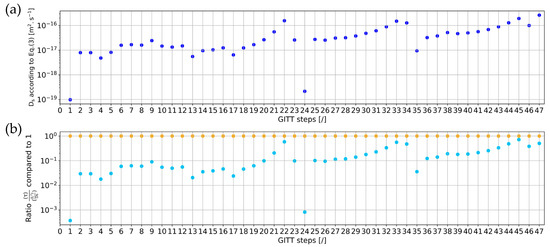 Figure 3a shows the results of the diffusion coefficient Ds determined with Equation (3) for all the GITT steps of the NVPF positive electrode material. The values range from to . It can be observed that for most of the GITT steps, is not significantly lower than , with a ratio in Figure 3b ranging between 0.01 and 1, which was, however, the condition for the determination of Ds via Equation (3).