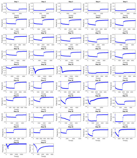 Figure 5 presents an overview of the evolution in time of the NVPF electrode potential for each GITT step from 1 to 47.