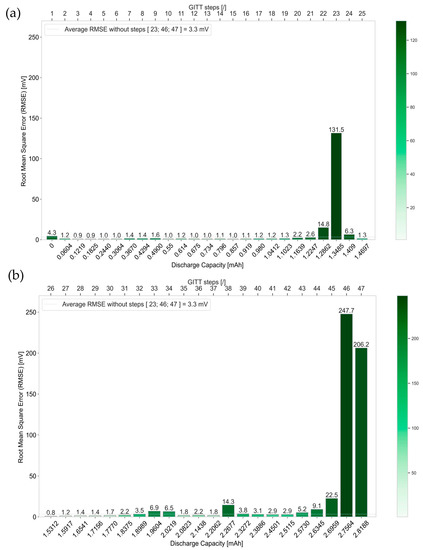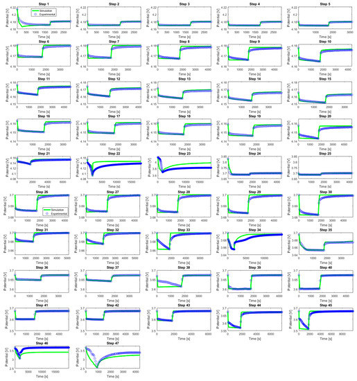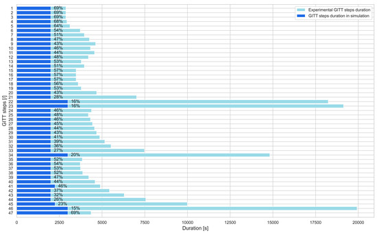 The dark blue bars in Figure 6 highlight the duration of the GITT steps used for simulation purposes. An advantage of this methodology is that the duration of the GITT steps to be taken into account in the simulations for the Ds and k parameters’ extraction can be shortened compared to the experimental ones. On average, only 46% of the experimental step duration should be taken into account as an input parameter of the model to carry out the simulation of the GITT steps. For long steps associated with phase transitions occurring in the material, only 16% of the experimental step duration should be simulated. This enables a reduction in the time needed for simulating and extracting both Ds and k parameters for each step, which reduces the total time required for the simulation of the entire GITT characterization.