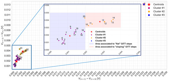 Unsupervised k-means machine learning is achieved for the clustering of the 47 GITT steps according to their voltage characteristics abstracted via the differences and . Figure 7 presents an overview of the clustering of GITT steps 1 to 20. A total of three clusters and their centroids were identified. Particularly, step 1 is representing a cluster as such, with its x and y coordinates being those of the centroid itself. The two other clusters, clusters 1 and 2, comprise a total number of steps equal to 12 and 7, respectively.