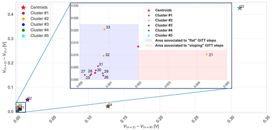Figure 8 presents an overview of the clustering of GITT steps 21 to 33. A total of five clusters and their centroids were identified. Particularly, steps 22, 23, and 24 are each representing one cluster as such, whose x and y coordinates are those of the centroids themselves. The two other clusters, clusters 1 and 2, comprise a total number of steps equal to 7 and 3, respectively. The centroid of cluster 2, associated with a difference equal to 2 mV, delimits the flat and sloping GITT step areas. Steps belonging to cluster 2 are observed not to be all part of the same area, i.e., steps 32 and 33 belong to the purple area, while step 21 belongs to the red area. According to these observations, steps 22, 23, and 24 of clusters 3, 4, and 5 can be classified as sloping steps. The area of flat GITT steps is defined by a set of nine steps {25–33}, while the area of sloping steps is defined by a set of four GITT steps {21–24}.