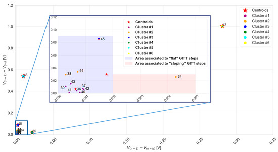 Figure 9 presents an overview of the clustering of GITT steps 34 to 47. A total of six clusters and their centroids were identified. Particularly, steps 35, 45, 46, and 47 are each representing one cluster as such, whose x and y coordinates are those of the centroids themselves. The two other clusters, clusters 1 and 2, comprise a total number of steps equal to 7 and 3, respectively. The centroid of cluster 2, associated with a difference equal to 1.8 mV, delimits the flat and sloping GITT step areas. Steps belonging to cluster 2 are observed not to be all part of the same area, i.e., steps 38 and 44 belong to the purple area, while step 34 belongs to the red area. According to these observations, steps 35, 45, 46, and 47 of clusters 3, 4, 5, and 6 can be classified as sloping steps. The area of flat GITT steps is defined by a set of 10 steps {36–45}, while the area of sloping steps is defined by GITT step {34}.