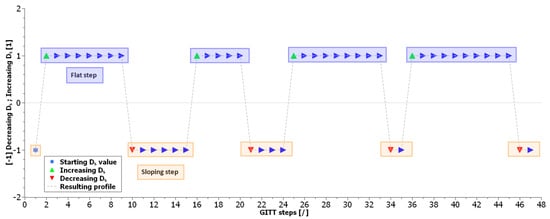 In Figure 11a, when switching from a flat to a sloping step category (e.g., from step 9 to 10), as when switching from a sloping to a flat step category (e.g., from step 15 to 16), the value of Ds clearly decreases and increases, respectively, in accordance with Figure 10. These switches are accompanied by changes in the order of magnitude of Ds. These observations are reflecting the occurrence of phase transitions in the NVPF electrode material that can be identified using advanced XRD characterization techniques [50,51]. Several plateaus can be observed in the diffusion coefficient Ds profile. These are generally lower in the second compared to the first part of the GITT characterization.