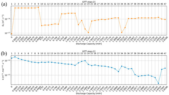 (a) Evolution of the diffusion coefficient Ds with the GITT steps and the discharge capacity; (b) evolution of the reaction rate constant k with the GITT steps and the discharge capacity.