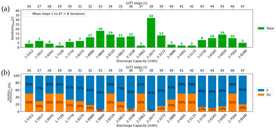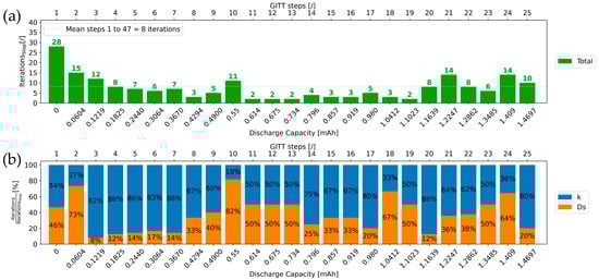 Figure 12b and Figure 13b show that for 67% of all the GITT steps, the share of iterations (with respect to the total number of iterations) to extract the k value is higher than what is needed for Ds. Thus, for most of the steps, the number of iterations needed to extract the final k value is higher than what is needed to determine the final Ds value. This is in line with the continuous decreasing trend with local variations in the k profile in Figure 11b. In particular, more iterations for the extraction of Ds and k final values would be initially required for GITT steps associated with a switch in the step category. In practice, around 10 iterations are needed for these steps. This results from the definition for these steps, of greater increments used for the iterations, achieved as part of the optimization of the methodology.