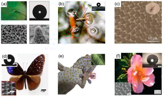 In nature, a large number of plants and animals have superhydrophobic properties of their own. German botanists Barthlott and Neinhuis [21] revealed the surface microstructure of lotus leaves and suggested that the self-cleaning properties of lotus leaves is caused by micro/nano structures. The surface of the lotus leaf has micron-sized bumps and nanometer-sized wax crystals attached to the bumps, as shown in Figure 1a [22,23,24,25]. In addition to lotus leaves, there are other plants and animals with superhydrophobic properties in nature, such as the legs of water striders [26], eyes of mosquitoes [27], wings of butterflies [28], geckos [29], rose petals [30], etc., as shown in Figure 1. Inspired by the above-mentioned plants and animals, researchers have developed many superhydrophobic surfaces, but some superhydrophobic surfaces are not widely used due to their unstable properties and susceptibility to environmental and temperature influences. Therefore, this is the most important research task for the wide application of superhydrophobic surfaces.