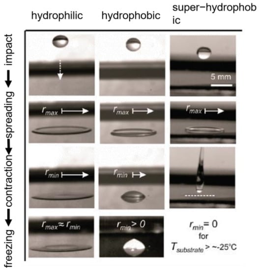 Surfaces with a contact angle of more than 150° and a rolling angle of less than 10° are generally defined as superhydrophobic surfaces. Superhydrophobic surfaces usually have micro/nano structures. When a water droplet falls on a superhydrophobic surface, the air is trapped in the micro-nanostructure, forming a Cassie–Baxter model of solid–liquid–gas three-phase contact [45,46] and reducing the interaction between the droplet and the surface, and when the surface is tilted, the droplet slides on the superhydrophobic surface [40,47,48,49,50]. In addition, due to the low contact angle hysteresis (CAH < 5°) of superhydrophobic surfaces, droplet bounce behavior will occur when a water droplet comes into contact with a superhydrophobic surface at an initial velocity; the droplet will first spread into a pancake shape. This process can store kinetic energy; the stored energy then causes the droplet to shrink into a sphere and finally rebound from the superhydrophobic surface [51]. As shown in Figure 3, droplets adhere to and freeze on hydrophilic and hydrophobic surfaces because they do not fully retract when they impact, whereas impacting droplets on superhydrophobic surfaces can fully recoil and rebound before freezing occurs. In summary, superhydrophobic surfaces can remove water droplets before they freeze [41].