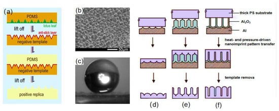 Nanoimprint lithography is also a technique that can replicate surfaces features, which is mainly done by heat and pressure and is capable of replicating morphologies of nanometers [68]. Lee et al. [66] prepared nano-polystyrene (PS) surfaces with controllable stretch ratios by using nanoimprinting, as shown in Figure 4d–f. Firstly, textured aluminum sheets and nanoporous alumina were prepared as replica templates, then a certain amount of heat and pressure was applied to drive the polymer melt to impregnate the nanopatterns of the replication templates, and, finally, the replication template was removed from the polymer substrate by reacting with Al in saturated HgCl2 solution to obtain a large area of nanostructured PS surface. The contact angle of the synthesized surface was between 155.8° and 147.6° and the synthesized surface was slightly tilted; water droplets that fall on the superhydrophobic surface will roll out. It is worth paying attention to the circumstance that the thickness of the replica template can be varied to control the length of the PS nanofibers.