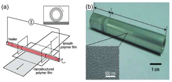 (a) Rolling on a film using a tubular template at the right temperature and pressure [69]. (b) Tubular porous anodized aluminum template; inset is an SEM image of the surface [69].