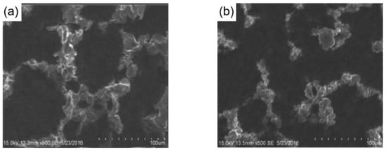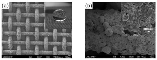 (a) SEM images of the copper mesh after coating [71]. (b) FESEM images of copper mesh wire after spraying [71].