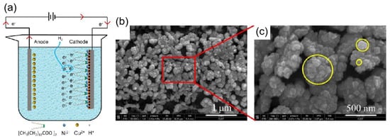 Electrochemical deposition is a technique for crystallizing metals or oxides by causing the cations and anions in a solution to migrate and produce redox reactions on the surface of the working electrode under the influence of an electric field. The shape and rate of crystal formation can be changed by adjusting the voltage, current, and concentration of the reaction solution. For instance, Yang et al. [76] created a nickel film superhydrophobic surface by depositing nickel onto a copper surface using a one-step electrodeposition process. As shown in Figure 7a, a homogeneous electrolyte was made from a mixture of nickel chloride (NiCl2–6H2O) and myristic acid (CH3(CH2)12COOH), where myristic acid served as a surface modifier. When an electric current was applied, nickel ions (Ni2+) moved to the cathode electrode and gained electrons to produce nickel (Ni). In addition, nickel ions (Ni2+) reacted with myristic acid (CH3(CH2)12COOH) to form nickel myristate (Ni[CH3(CH2)12COO]2), which formed low surface energy functional groups on the cathodic electrode surface. Meanwhile, some hydrogen ions (H+) around the cathode plate also gained electrons to form hydrogen (H2) during the reaction process, the released hydrogen gas caused the surface of the cathode electrode to be loosened. The above reactions resulted in a nickel film superhydrophobic surface with a rough structure such as cauliflower or thorn, as shown in Figure 7b,c.