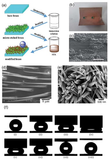Similarly, Li et al. [77] used electrochemical deposition to gain a hydrophobic ZnO film. Then, the superhydrophobic ZnO film was gained with (fluoroalkyl) silane modification; the electrochemical settings may be adjusted to alter the film’s thickness and morphology. Shirtcliffe et al. [78] electrodeposited copper ions from an acidic copper sulfate solution onto the surface of a copper plate by electrochemical deposition, forming a rough surface. Then, superhydrophobic surfaces were obtained after heat treatment and fluorination. To create superhydrophobic surfaces with high contact and low rolling angles, Su et al. [79] performed Ni electrodeposition in a typical Watts bath containing NiSO4, NaCl, and H3BO3. Then, the superhydrophobic surface was obtained by heat treatment and fluorination. Remarkably, the superhydrophobic surfaces may be employed in both alkaline and acidic conditions and exhibit good hardness and wear resistance.