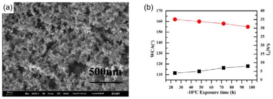However, several of the above methods have defects such as complex design, high energy consumption, high cost, and environmental pollution, so it is important to research valid anti-icing methods. The passive methods refer to a chemical or physical modification of the surface so that the surface has the effect of rapid separation of water droplets from the substrate and delayed icing and can reduce the adhesion of ice to the substrate [11,12,13,14,15]. With the development of bionics, superhydrophobic surfaces were discovered by researchers and can be used for anti-icing. The surfaces with a contact angle of more than 150° and a rolling angle of less than 10° are defined as superhydrophobic surfaces [16,17,18,19,20]. Using a superhydrophobic surface to avoid ice formation is considered a promising method for anti-icing.