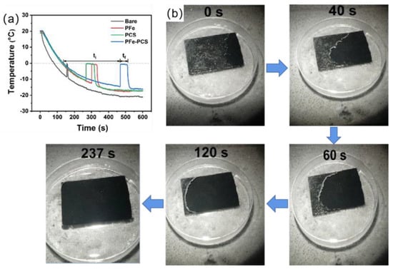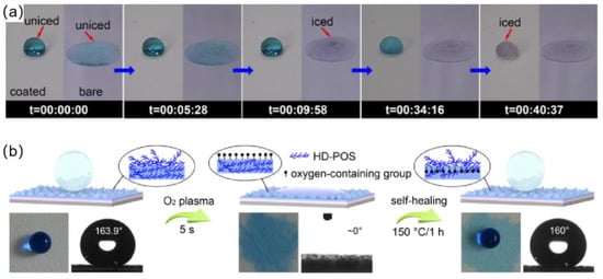 Currently, researchers have conducted numerous studies to understand the underlying physicochemical mechanisms of icing and have developed many de-icing and anti-icing strategies [5,6]. Anti-icing and de-icing methods can be divided into active and passive methods. Active methods are through the use of external energy to de-icing, such as electrothermal de-icing, mechanical de-icing, chemical de-icing, etc. Electrothermal de-icing mainly applies current or voltage by the electric heating components so that the electrical energy is transformed into thermal energy and the heat energy can melt the ice [7]. M. Mohseni et al. [8] proposed the view of an embedded thermal element as an anti-icing and de-icing system for composite airfoils, in which an electric wire was buried into the composite airfoil as a thermal element, by which its surface could reach 20 °C and effectively prevent the surface from icing. However, this method has a large energy consumption and cost, and when the temperature is too high, it may cause damage to the surface material and even easily cause a fire. Mechanical de-icing is achieved through direct mechanical impact or vibration to break up the ice layer, which may way easily damage the road or material surface, and cable de-icing and other high-altitude operations are unsafe [2]. Chemical de-icing is mainly performed using substances to melt the ice, such as organic salts, glycols, and ethanol, but the frequent use of chemical methods for de-icing can have serious negative impacts on soil and water systems [9,10].
