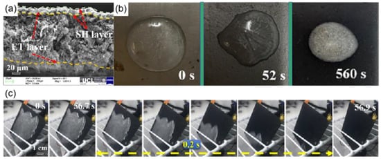 (a) Schematic diagram of the electrodeposition process to prepare a superhydrophobic nickel film [76]. (b) SEM image of the nickel film after 10 min of electrolysis [76]. (c) Enlarged SEM image of the red line part [76].