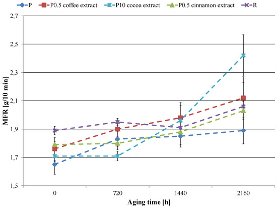 The significant increase in MFR due to the aging of samples containing a large number of extracts can be explained by the fact that in the case of polyphenols, there is a certain limit amount above which they lose their anti-aging properties. In larger amounts, these compounds, instead of stopping the aging process, accelerate it significantly. As a result, we observe a significant increase in flow because of intensified degradation processes.