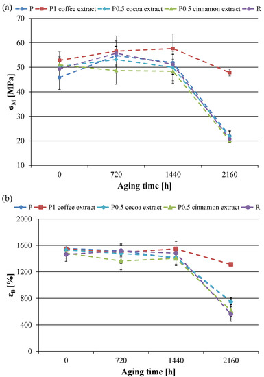 Values of (a) tensile strength (σM) and (b) strain at break (εB) of selected samples as a function of aging time.