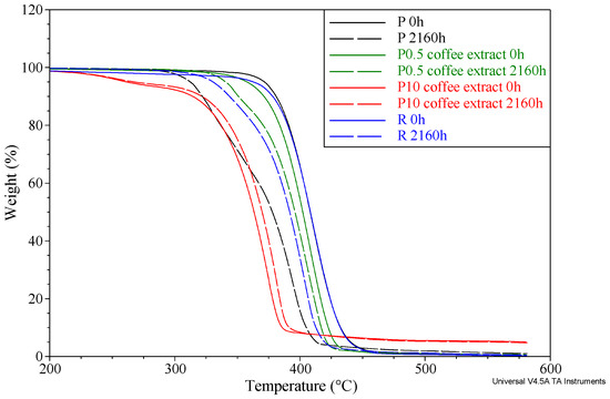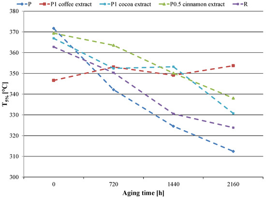 With low contents of extracts (up to 1% by weight), the proposed substances positively influenced the changes in thermal resistance as a function of aging time without causing too large of an initial decrease in thermal resistance. In the case of cocoa and cinnamon extracts, the behavior of samples containing these extracts under the influence of accelerated aging was similar to that of sample R. As the aging time progressed, a decrease in the value of T5% was observed but the changes were smaller than in the case of sample P, which indicates better anti-aging properties of the extracts. The differences in T5% between the samples aged for 2160 h and the unaged samples were 26.2 °C for 1 wt.% of cocoa extract and 31.3 °C for 0.5 wt% of cinnamon extract. In the case of coffee extract, the course of changes in thermal resistance as a function of aging time was different. Despite the initial decrease in T5% after adding 1 wt.% of coffee extract, the value of this parameter did not change significantly due to accelerated aging. The T5% after 2160 h of accelerated aging was practically at the same level as the value obtained for the unaged sample. Thus, it was the coffee extract that showed the best anti-aging properties, taking into account the effectiveness in limiting the decrease in thermal resistance.