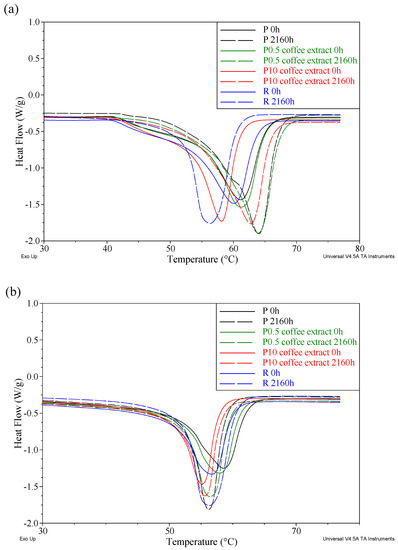 DSC curves of unaged and aged samples containing coffee extract; (a) first heat (b) second heat.