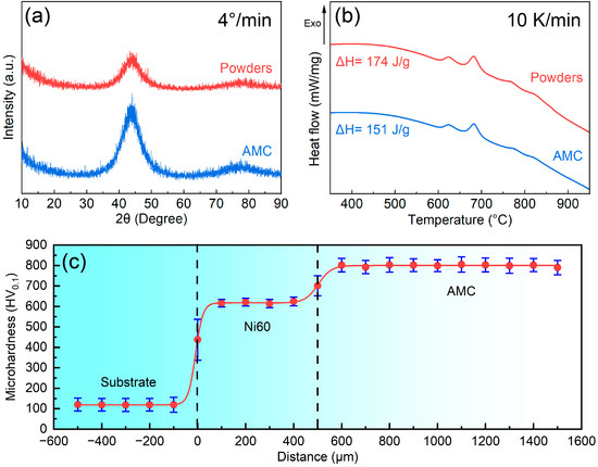 (a) XRD patterns and (b) DSC curves of the Fe-based AMC and Fe-based amorphous powders. (c) Microhardness of the Fe-based AMC, Ni60 interlayer, and dissolvable Mg-RE alloy substrate.